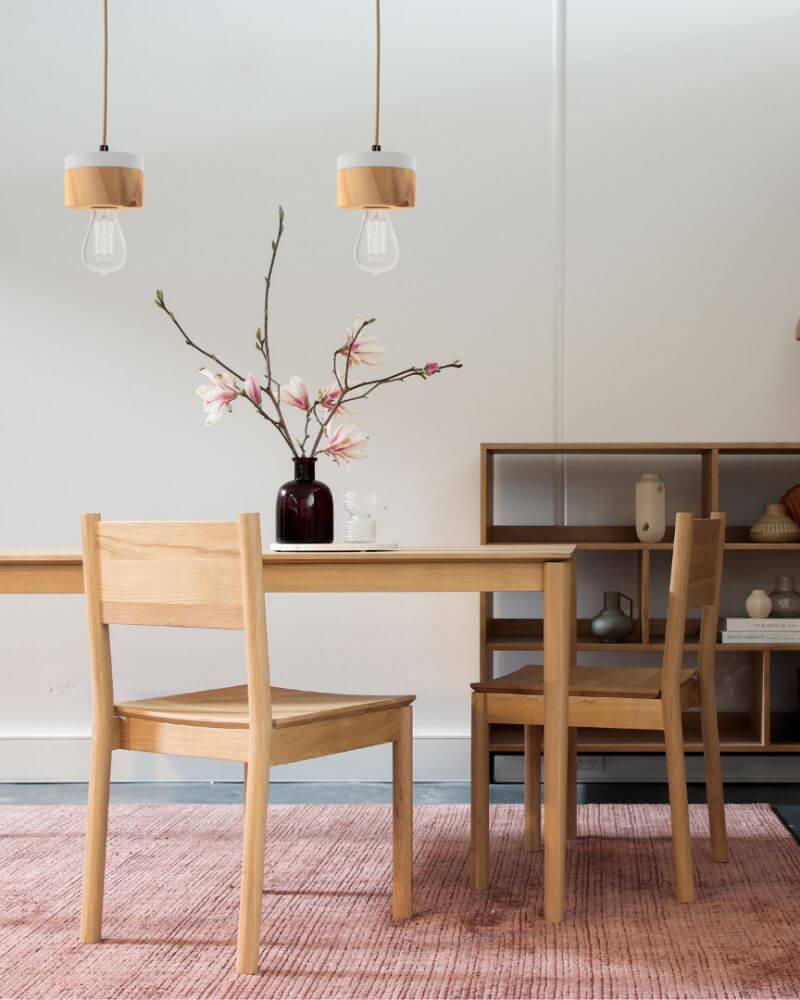 Das Design ist dabei geradlinig, reduziert und funktionell. Trotz dieser Schlichtheit sorgt die typisch markante Maserung der Zirbe in Kombination mit Pastell- oder Naturtönen für eine natürliche und warme Wohnatmosphäre. Das Kabel aus Naturfasern sowie der Baldachin aus Zirbenholz komplettieren das skandinavische Leuchtendesign.
